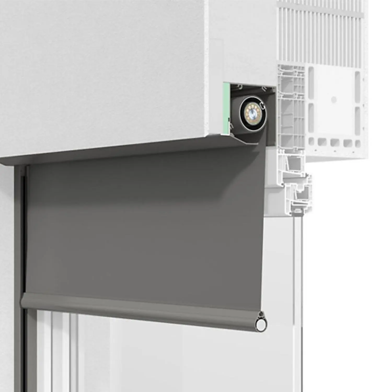 Sprilux rollSCREEN.2 (base INTEGO) è un sistema esterno in alluminio completamente integrato nella facciata, dotato di cassonetto intonacabile e terminale inferiore arrotondato.